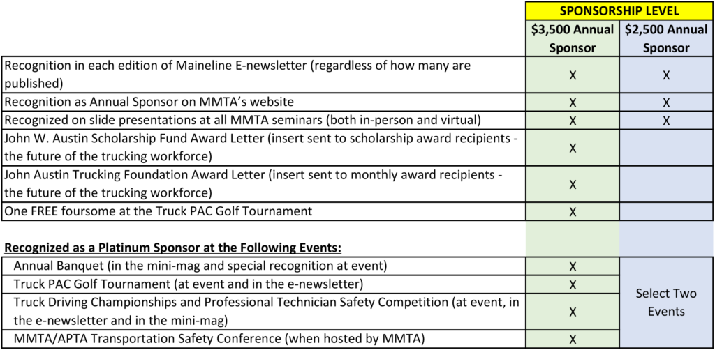 Participation in this Annual Sponsorship Program is an easy, effective and efficient way to support the MMTA and be sure your company is recognized all year round. In exchange, your company will receive recurring exposure in the Maineline E-Newsletter, prominent recognition on MMTA’s website and at our Annual Banquet, TDC, PTSC, golf tournament, Transportation Safety Conference and every seminar we host whether it is in-person or virtual.