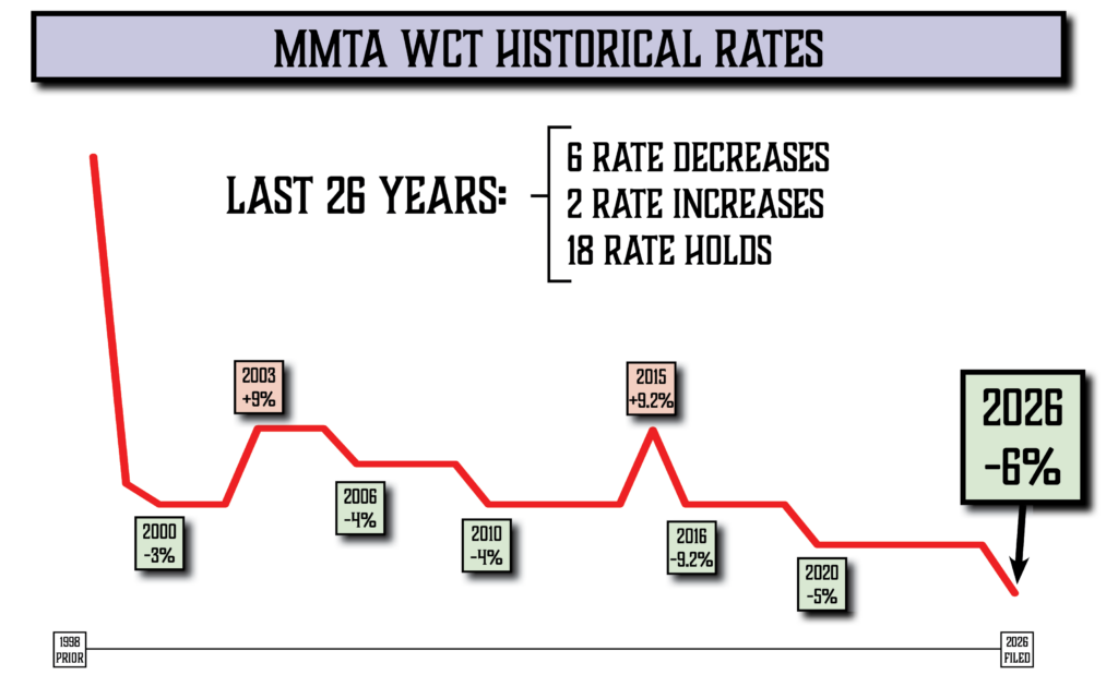 MMTA Workers’ Compensation Trust members will see additional savings in their January premiums, this time in the form of a 6% rate decrease for 2026. The Trustees of the program are confident the Bureau of Insurance will approve the actuarially sound funding plan as they consider the unprecedented strength of the group’s renewal application. This marks the lowest rates have been in the Trust’s 35-year history and it comes at a time where predictability and stability continue to be needed by Maine businesses.